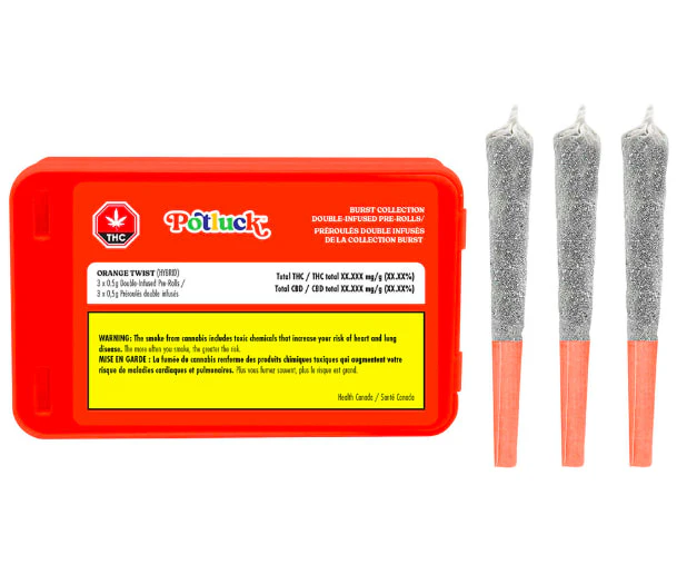 Introducing Orange Twist by Potluck. Explore bold cannabis flavours in our single pre-roll, bursting with citrus and zesty notes. Each pre-roll is double infused and coated in kief for galactic flavours.